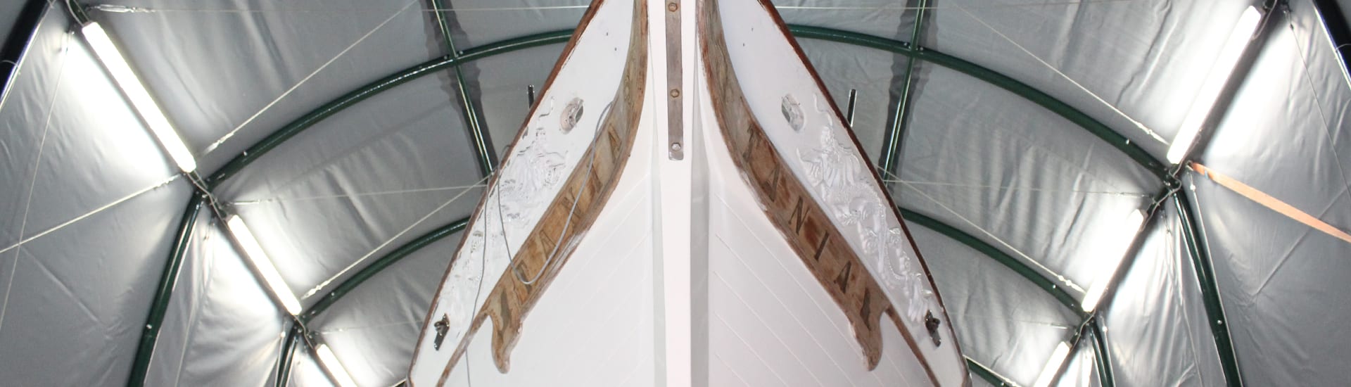 Buongiorno! La tenda è lunga 14 m e larga 8 m. La mia barca a vela Tania ci sta senza problemi. Abbiamo impiegato un totale di due giorni per montare il tendone. Con un po’ più di esperienza, ci si può mettere anche di meno (era la nostra prima volta).
